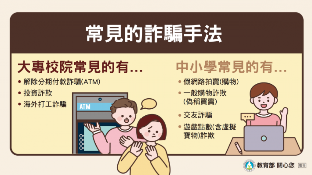 近年來學生擔任車手涉詐欺案件數攀升,尤以12至23歲涉案最多,教育部藉由真實案例,解析學生擔任詐騙車手所可能承擔的法律責任,製作本案懶人包,避免學生遭不法分子利用,衍生後續的法律風險與責任。