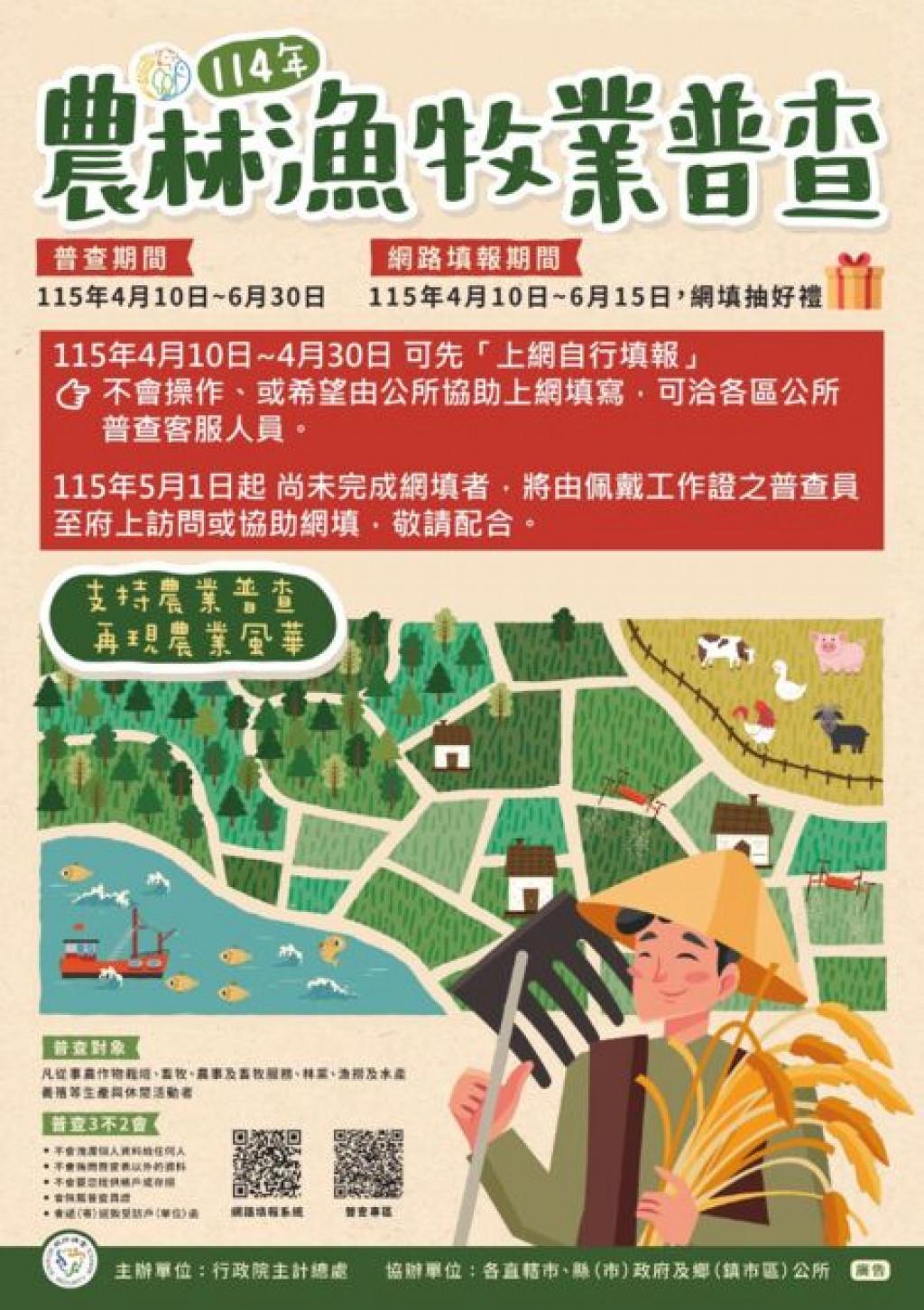 「114 年農林漁牧業普查」於 115 年 4 月 10 日至 6 月 30 日辦理,請縣民配合,上網填報 還可以參加抽獎!